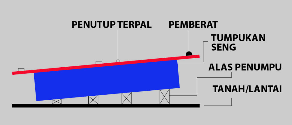 • Apabila disimpan ditempat yang terbuka, harus ditumpuk secara miring untuk menghindari genangan air di lembah atap metal geiombang dan terus ditutup dengan terpal/plastik.